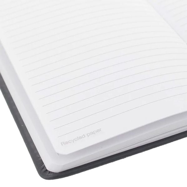 The A5 Airbus Notebook 'We Make It Fly' features 100 high-quality recycled paper sheets, reflecting a commitment to sustainability and an embossed black hard cover. It is the perfect choice for those seeking a functional and uniquely designed notebook inspired by Airbus.