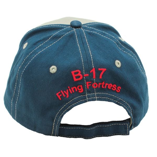 B-17 embroidered hat made from brushed cotton with sewn eyelets, pre-curved bill and velcro closure. This cap features the B-17 on a dark blue and beige hat with beige contrasting stitching with beige piping on the bill.