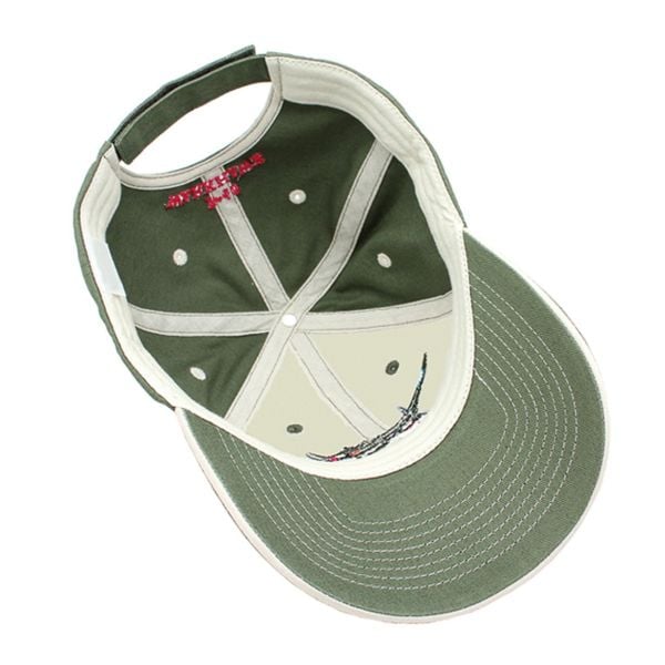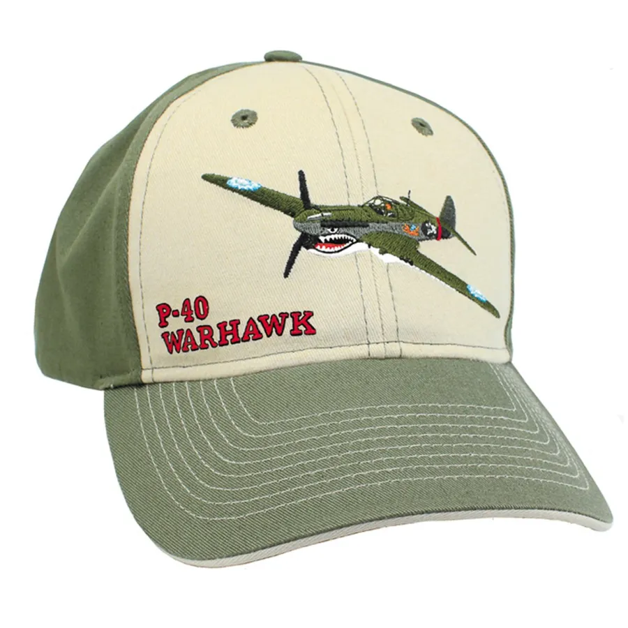 P-40 embroidered hat made from brushed cotton with sewn eyelets, pre-curved bill and velcro closure. This cap features the P-40 Warhawk on a dark green and beige hat with beige and green contrasting stitching with beige piping on the bill.
