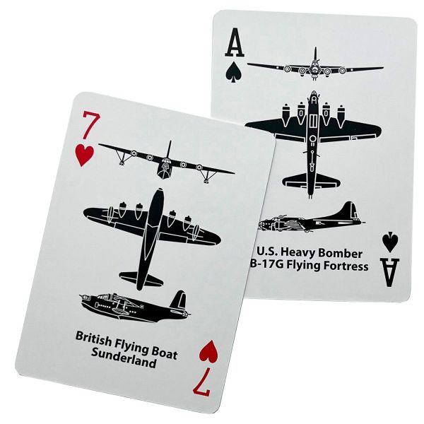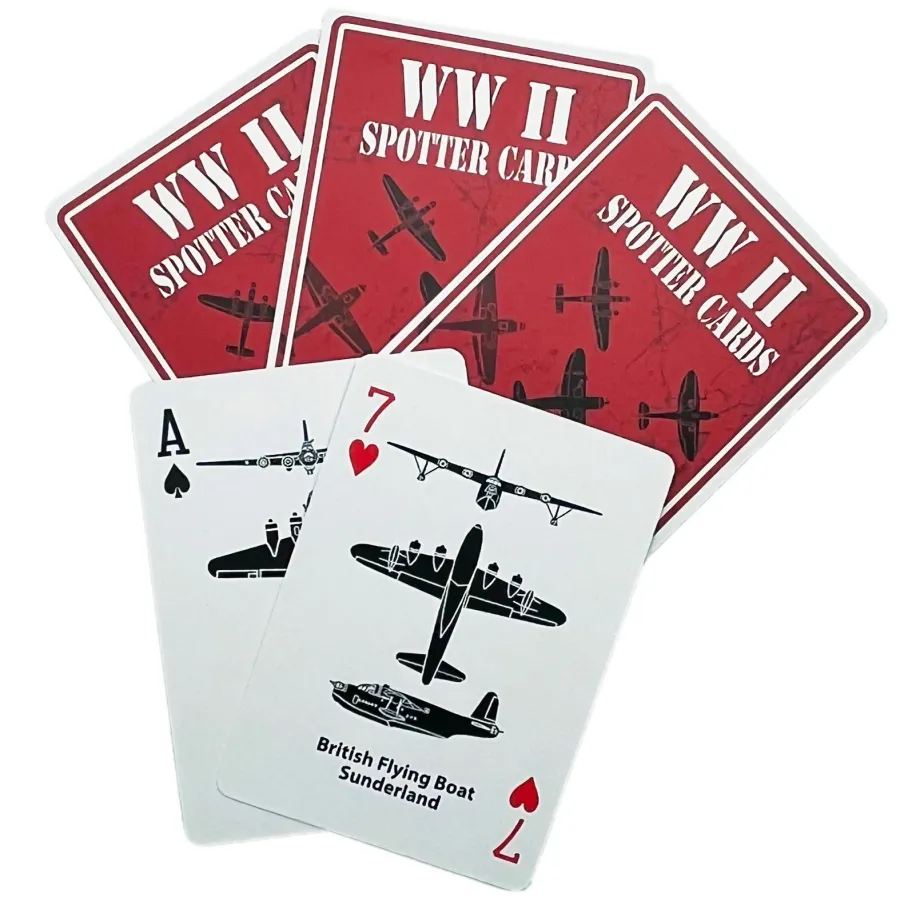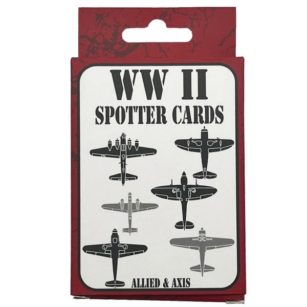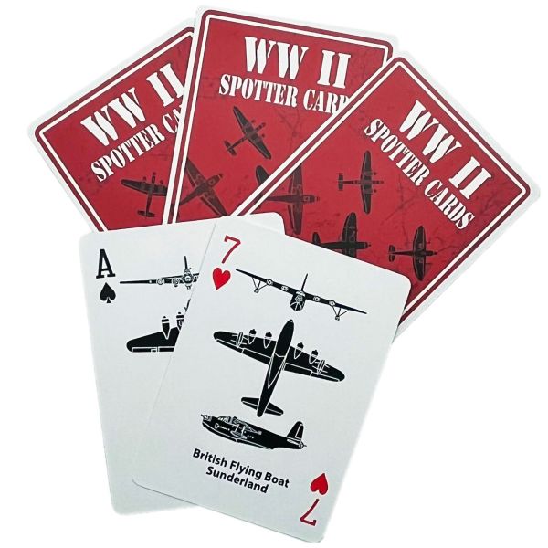 Spotter Deck playing cards were first issued in 1943 to help train Civil Defence ground observers. This authentic reproduction includes 3 silhouettes of each airplane from the United States, Great Britain, Germany, Italy and Japan.