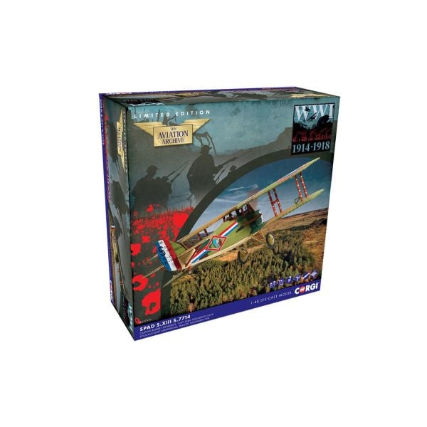 The Corgi diecast model of a SPAD S.XIII ‘S.7714’ flown by Cpt. Robert Soubiran of the 103rd Aero Sqn USAS is in the scale of 1:48 and comes with gear and stand