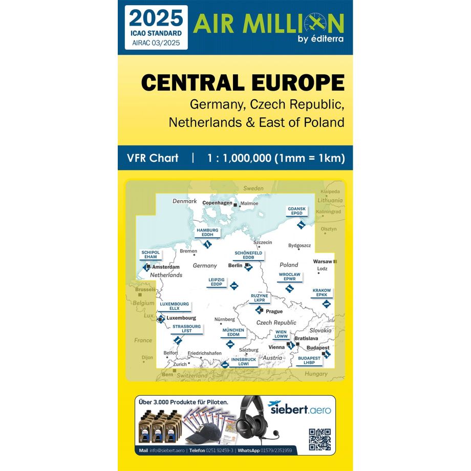This 2025 air million chart covers the whole of Germany, Czechia, Slovakia, Austria, Poland, and most of Switzerland, Hungary and Denmark at a scale of 1:1,000,000. The chart has all the ' AIP information necessary for flight : airspace SFC to FL180, controlled areas and restricted areas, airfields, radio resources etc.