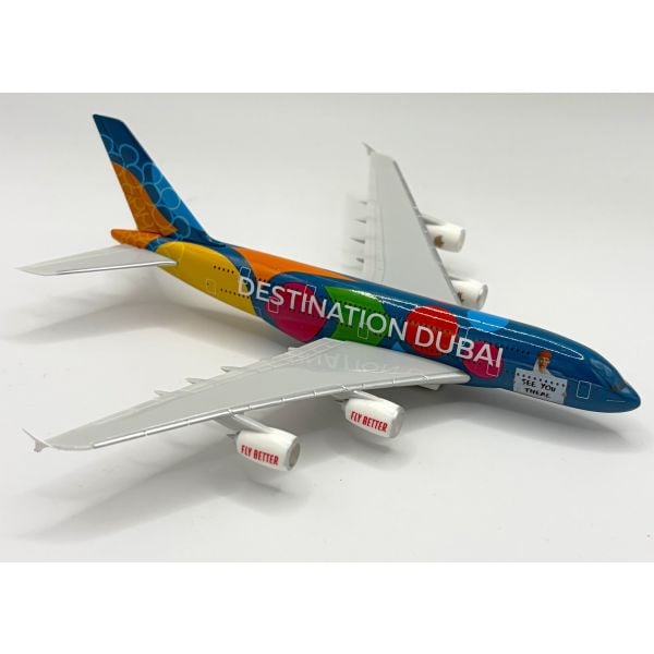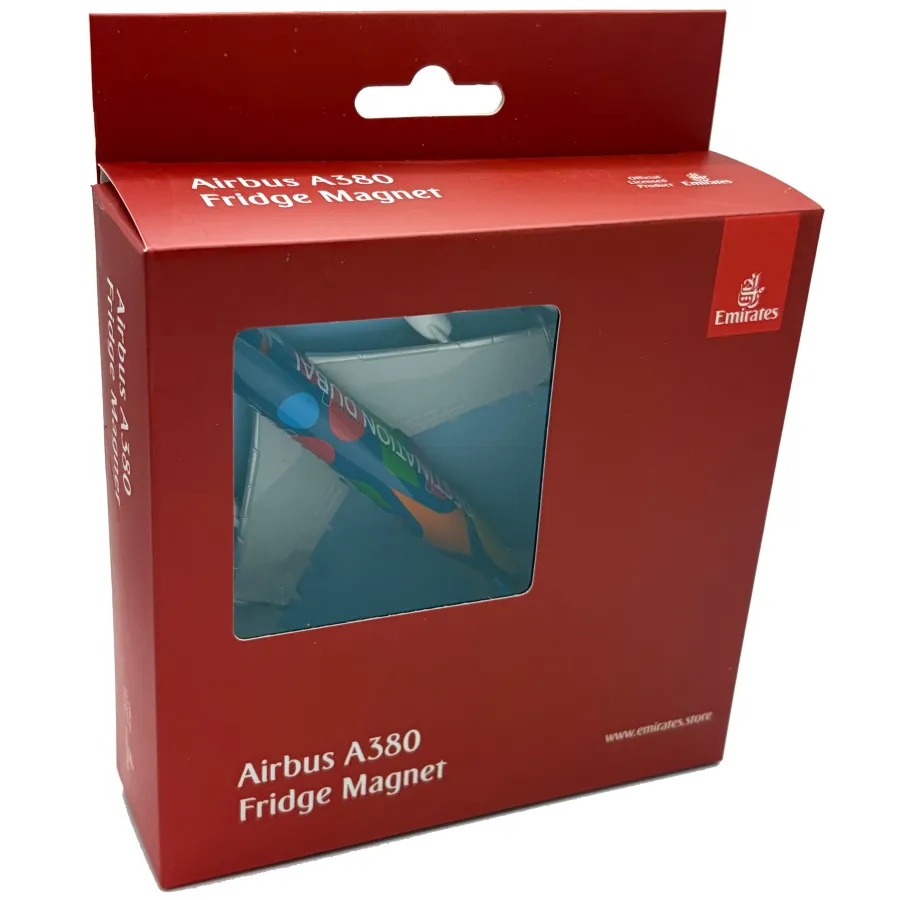 This Airbus A380 Emirates Destination Dubai magnet has a 15cm wingspan and is a stylish souvenir for all aviation lovers. This miniature magnetic model faithfully captures the form of the iconic airliner in service with Emirates and is designed for use on most metal surfaces, including refrigerators.