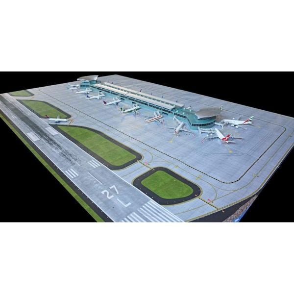 In all, 22 gates and jet bridges line the entire perimeter. Based on modern, contemporary airports, the new GeminiJets terminal features sweeping corrugated overhangs and sleek, linear facades. Wrap-around windows and battery-operated interior and rooftop LED lighting add realism and bring the terminal to life.