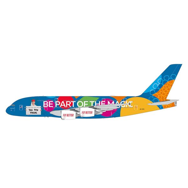 This Gemini Jets 1:200 scale model of the Airbus A380 airliner with the “Destination Dubai / Be Part Of The Magic” livery is made from die-cast metal with the Reg No. A6-EES