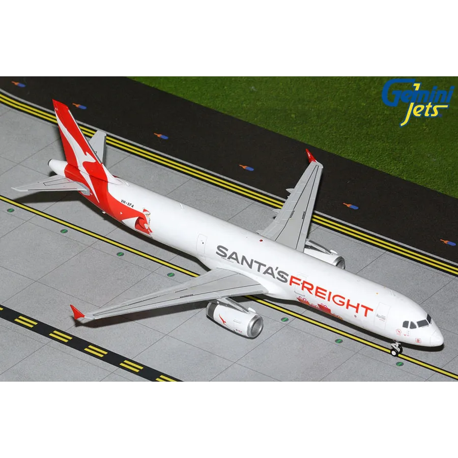 A premium quality airplane diecast model of the Airbus A321PTF with the Qantas 'Santa's Freight' livery, Reg: VH-XF4 in the larger scale of 1:200. Stand and landing gears are included.