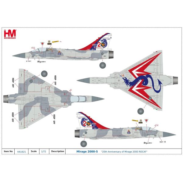 From Hobby Master this new for 2025 1/72 scale diecast model is of the Mirage 2000-5 “20th Anniversary of Mirage 2000 ROCAF” . It comes boxed with landing gear and display stand.