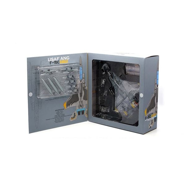 This is a 1:72 scale diecast scale model of the F-15C Eagle US ANG National Guard ready to display on its included landing gear. See above for display stand options.