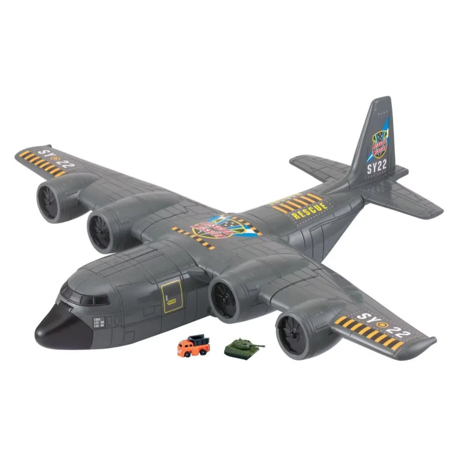 This large transport aircraft plane offers hours of fun play. Comes with two micro vehicles, a truck (colour can vary) and a tank.