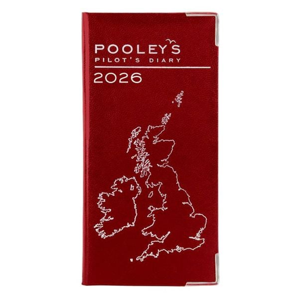 Pooleys Red 2026 Diary. Handsomely bound in leatherette with sliver embossed lettering with silver corners. Each contains a full listing of all UK Airfields, Sunrise to Sunset tables, useful aviation data, and addresses section. Also available in blue.