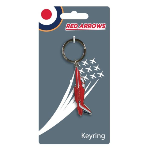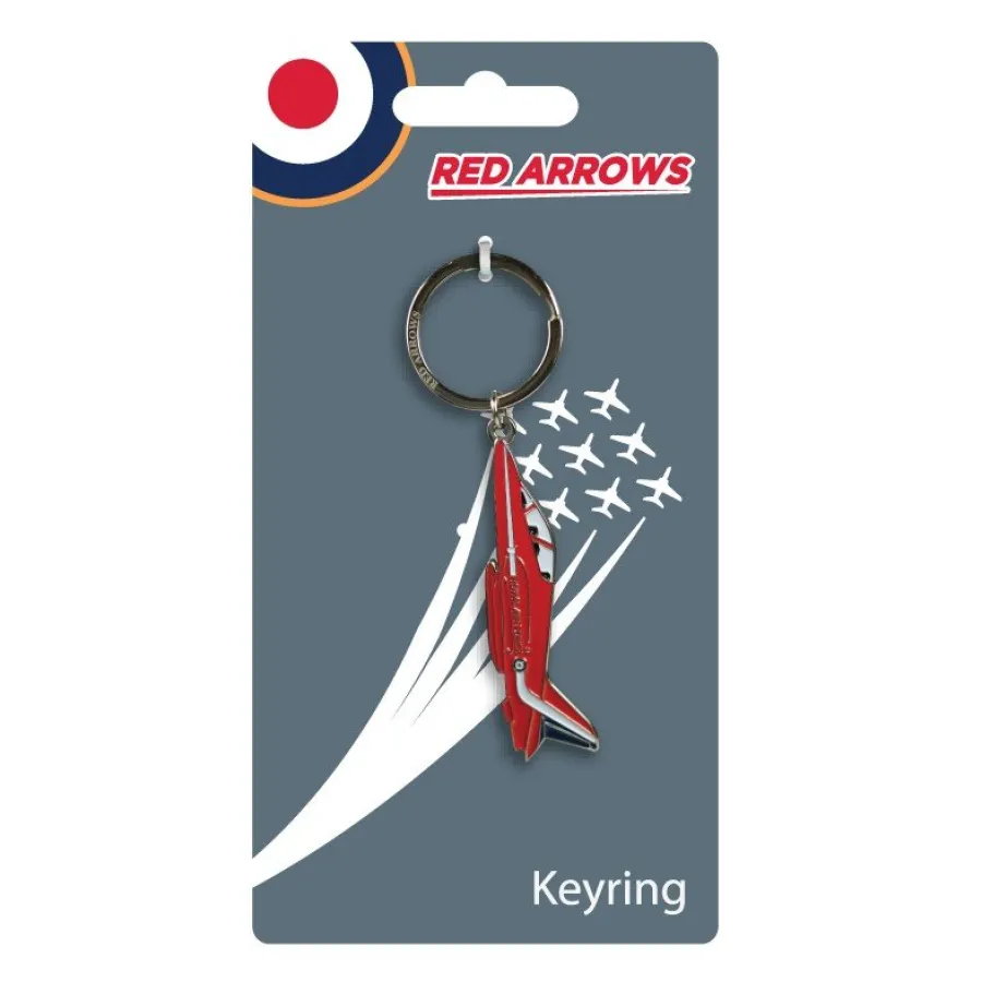 This enamel offical RAF keyring features the Red Arrows Hawk in side view profile. The dual control BAE Systems Hawk T1 has been used by the Red Arrows since 1979, replacing the Folland Gnat