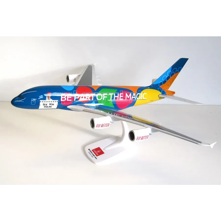 A plastic snap-to aircraft model, this is a 1:200 scale model of the Airbus A380 airliner with the Emirates Magic Of Dubai livery.