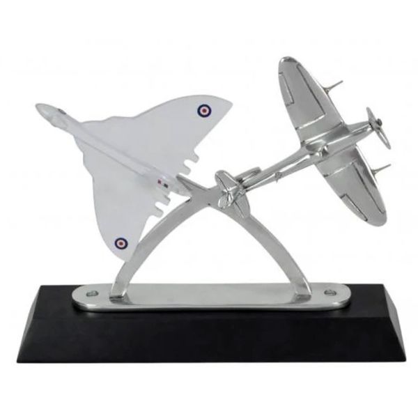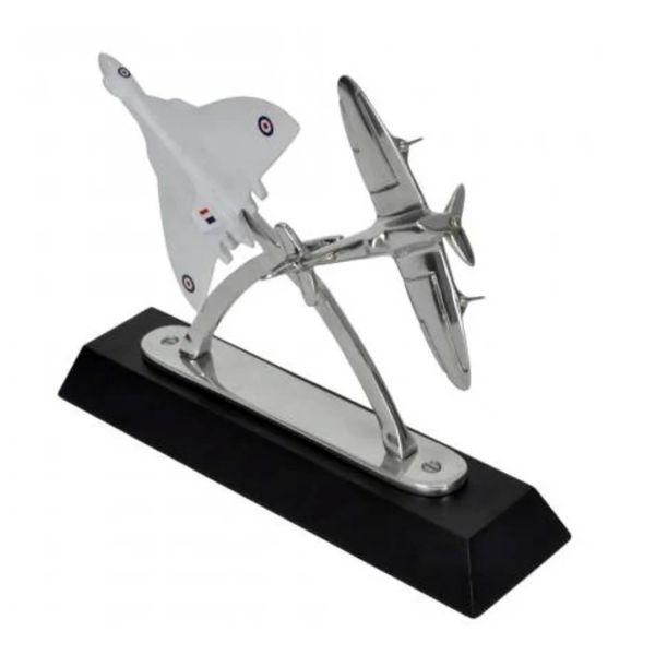 Crafted with precision and attention to detail, this model captures the iconic designs of the WWII Spitfire fighter and the mighty Vulcan bomber in one striking display piece.