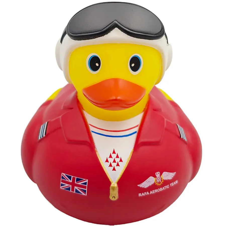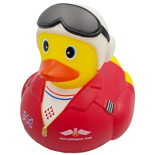 Our Red Arrows 60th Diamond Season RED duck has pulled up to the flight line in their red flight suit. This Red Arrows pilot duck is wearing his red flight suit with the Diamond 9 formation undershirt, a white helmet and goggles.