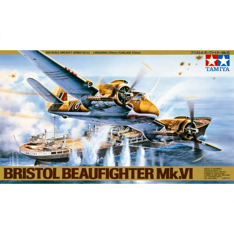 The Bristol Beaufighter was a versatile aircraft used by the Royal Air Force for a number of roles during WWII. This kit may be assembled as either a Mk.VI fighter version or a Mk.VI Coastal Command version. The short nose, thick wings, and angled horizontal stabilisers are all accurately reproduced and the engine and cockpit are full of detail. Two crew figures and three marking options are included.