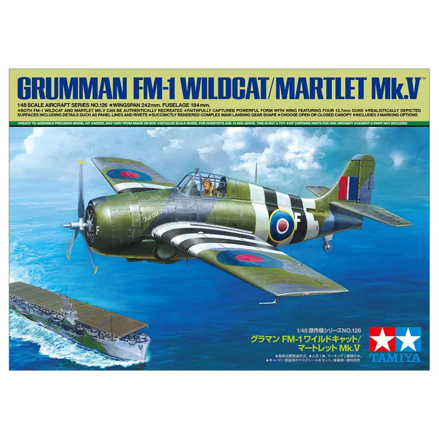 Based upon our popular 1/48 Grumman F4F-4 Wildcat (Item 61034), this kit authentically recreates the FM-1 featuring four machine guns with both the U.S. Navy and Royal Navy markings and one sitting pilot figure.