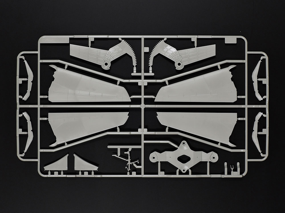 The variable sweep wing moves on internal gears. Wing parts are fitted on after fuselage assembly.