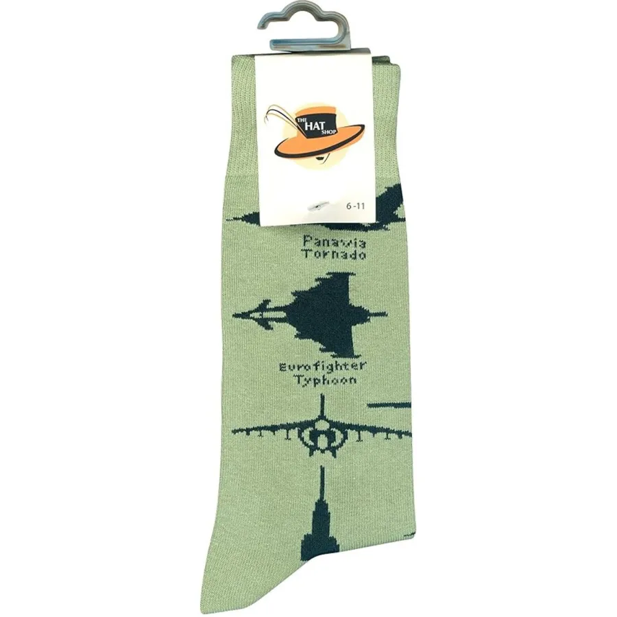 A pair of green coloured adult UK size 6 - 11 unisex socks, featuring different silhouettes of British fighters, including Panavia Tornado, Eurofighter, Harrier Jumpjet and British Aerospace Hawk.  These socks are manufactured by The Tie Studio, London and made from:  80% Cotton  17% Polyester 3% Spandex  They are machine washable and come with tag and hook
